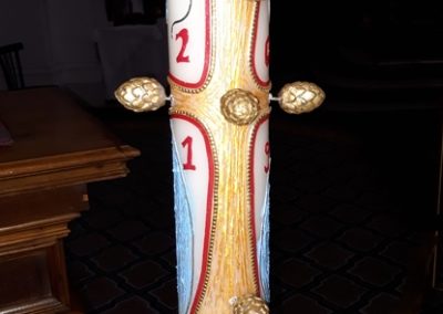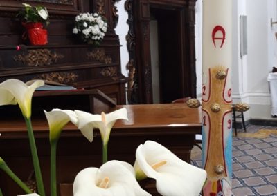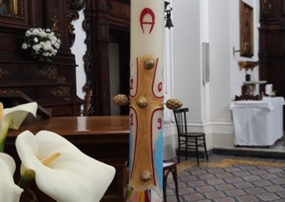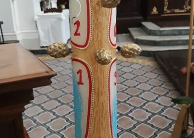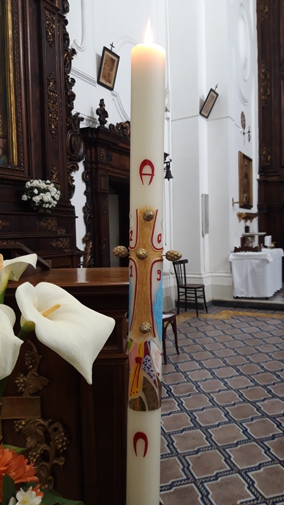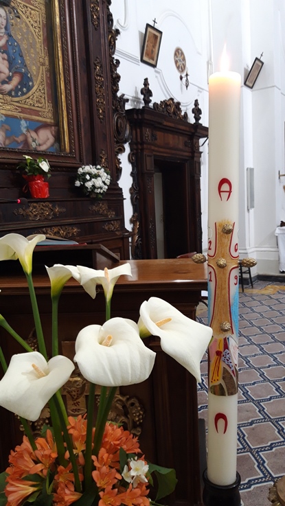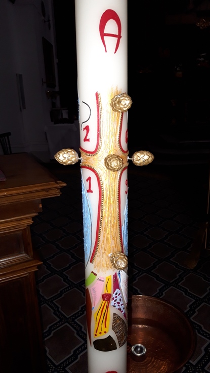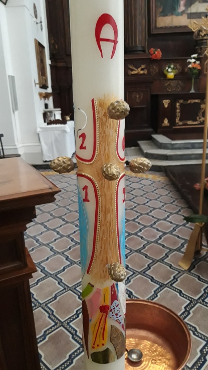 Quest’anno il cero porta in sé la Buona Novella della Risurrezione annunciata alla donne che al mattino presto si recarono al sepolcro, incontrando due uomini in abito sfolgorante che annunciano loro l’impensabile: “Non è qui, è risorto”! Sono loro a dare un senso al loro spavento! A dare una risposta alla loro paura con una notizia di Vita!