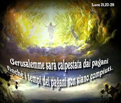 «Quando vedrete Gerusalemme circondata da eserciti, allora sappiate che la sua devastazione è vicina. Allora coloro che si trovano nella Giudea fuggano verso i monti, coloro che sono dentro la città se ne allontanino, e quelli che stanno in campagna non tornino in città; quelli infatti saranno giorni di vendetta, affinché tutto ciò che è stato scritto si compia. In quei giorni guai alle donne che sono incinte e a quelle che allattano, perché vi sarà grande calamità nel paese e ira contro questo popolo. Cadranno a fil di spada e saranno condotti prigionieri in tutte le nazioni; Gerusalemme sarà calpestata dai pagani finché i tempi dei pagani non siano compiuti.