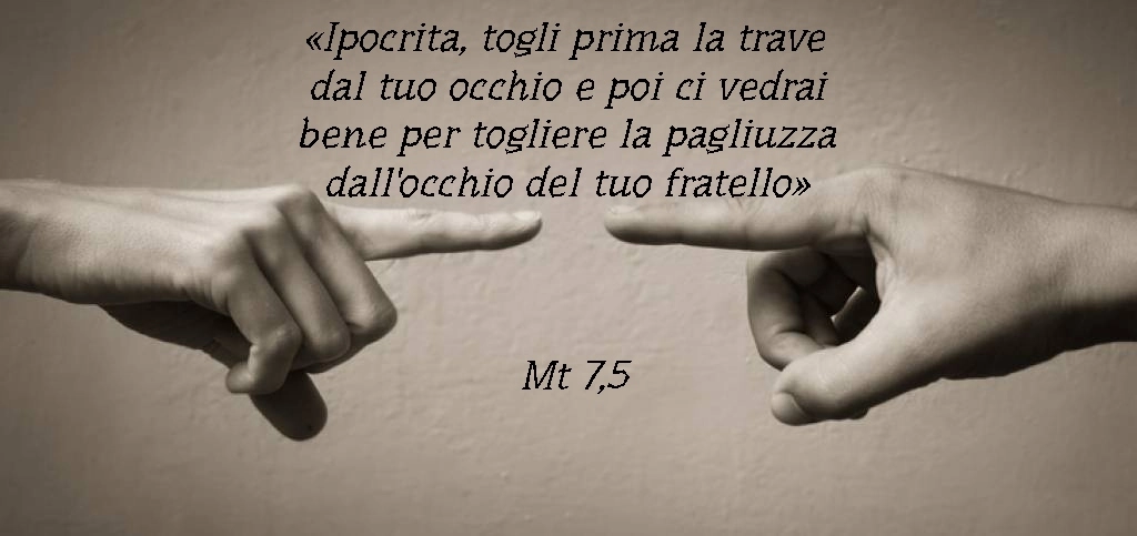 Perché guardi la pagliuzza che è nell’occhio del tuo fratello, e non ti accorgi della trave che è nel tuo occhio? O come dirai al tuo fratello: “Lascia che tolga la pagliuzza dal tuo occhio”, mentre nel tuo occhio c’è la trave? Ipocrita! Togli prima la trave dal tuo occhio e allora ci vedrai bene per togliere la pagliuzza dall’occhio del tuo fratello».