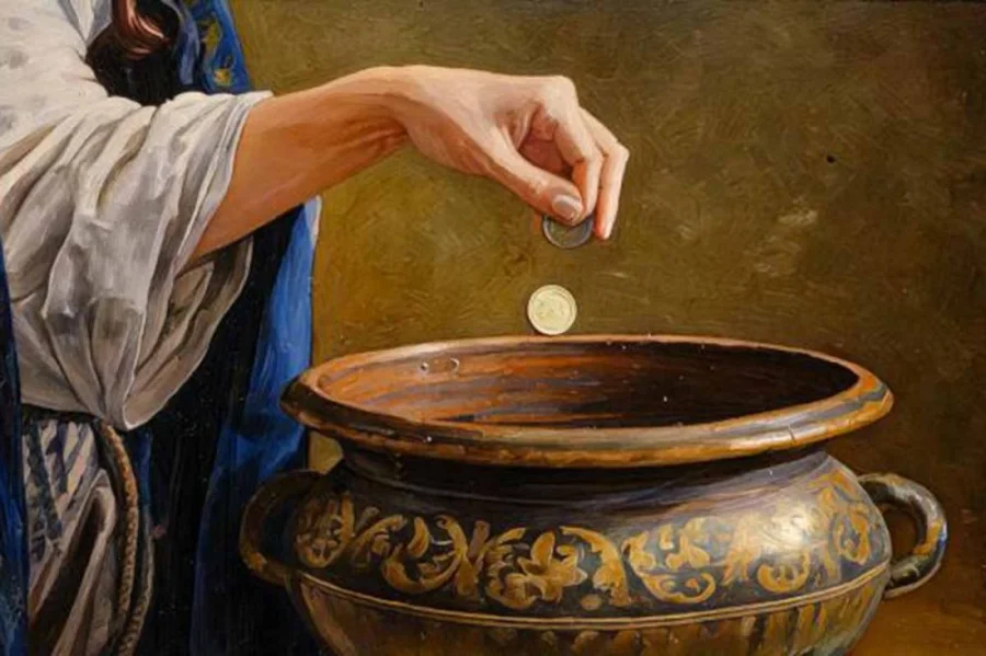Vide anche una vedova povera, che vi gettava due monetine, e disse: «In verità vi dico: questa vedova, così povera, ha gettato più di tutti. Tutti costoro, infatti, hanno gettato come offerta parte del loro superfluo. Ella invece, nella sua miseria, ha gettato tutto quello che aveva per vivere».