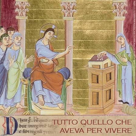Vide anche una vedova povera, che vi gettava due monetine, e disse: «In verità vi dico: questa vedova, così povera, ha gettato più di tutti. Tutti costoro, infatti, hanno gettato come offerta parte del loro superfluo. Ella invece, nella sua miseria, ha gettato tutto quello che aveva per vivere».