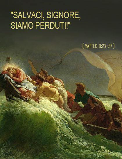 Allora si accostarono a lui e lo svegliarono, dicendo: «Salvaci, Signore, siamo perduti!». Ed egli disse loro: «Perché avete paura, gente di poca fede?». Poi si alzò, minacciò i venti e il mare e ci fu grande bonaccia.